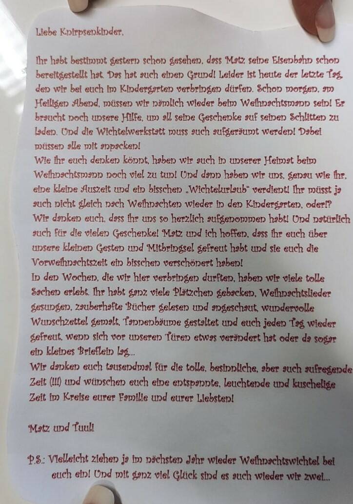 Dafür waren unsere Wichtel aber schon in der Nacht unterwegs und haben die Wunschzettel der Vorschulkinder gefunden. Und weil ja bald schon Weihnachten ist, haben sie die gleich mitgenommen und zum Weihnachtsmann geschickt!